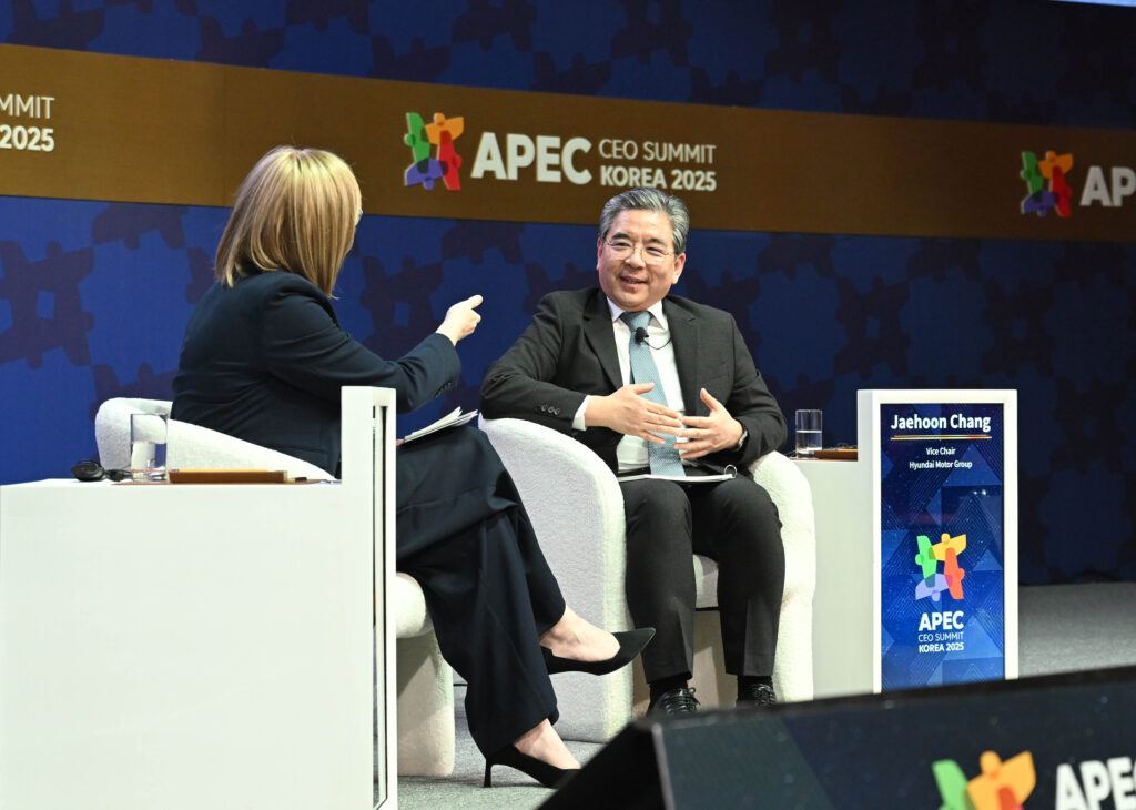 10月30日に韓国で開催されたアジア太平洋経済協力(APEC)CEOサミット韓国2025での水素戦略に関するハイレベル対話に登壇した、水素協議会(Hydrogen Council)の共同議長を務めるチャン・ジェフン現代自動車グループ副会長。対談相手は水素協議会のイヴァナ・ジェメルコヴァCEO。(写真は現代自動車提供)